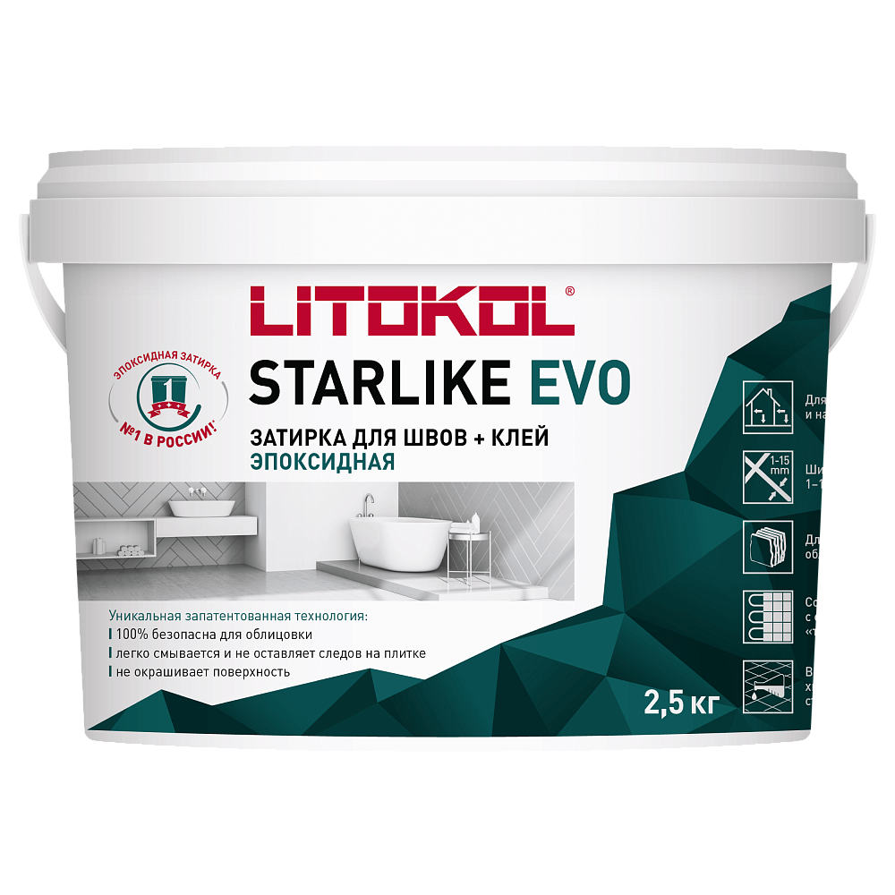 STARLIKE EVO двухкомпонентный эпоксидный кислотостойкий, щелочестойкий состав для затирки межплиточных швов с шириной шва от 1 до 15 мм и использования в качестве клея для всех видов облицовочной плитки и мозаики.